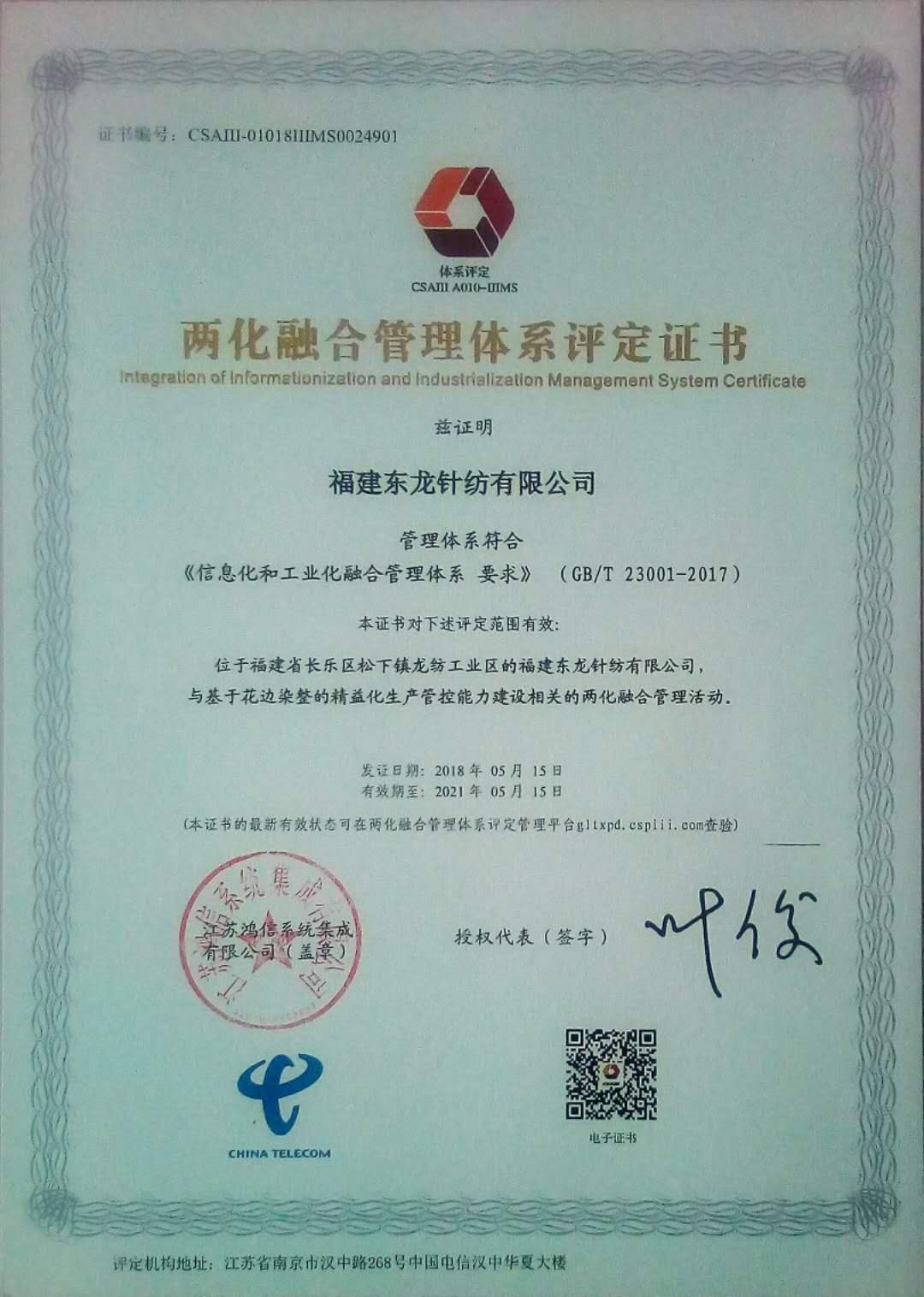工信部兩化融合管理體系評定證書/2018-09-04